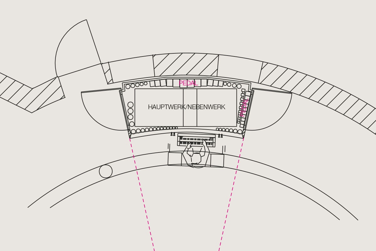Registerzahl und technische Ausstattung bestimmen die äußere Größe einer Orgel und deren zumeist rechteckigen Grundriss. Bei runden Räumen kann das Konflikte schaffen. Nicht so bei Claudius Winterhalter. Sein Entwurf erhielt den Zuschlag, weil er einen in das Raumkonzept passenden, ebenso einfachen wie schlüssigen Gestaltungsansatz vorlegte. Er wollte keinen „Orgelkasten“, sondern eine „Orgelplastik“, die sich als Kreisbogensegment in den runden Raum einfügt.
